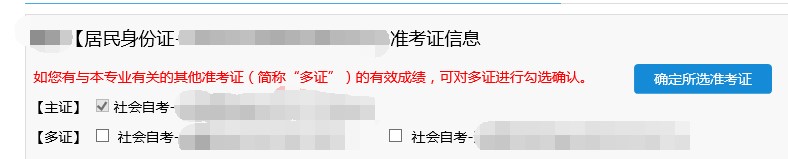 考生有本省多张准考证且其中成绩在本次毕业中需使用,则勾选相应准考证号,并点击【确定所选准考证】