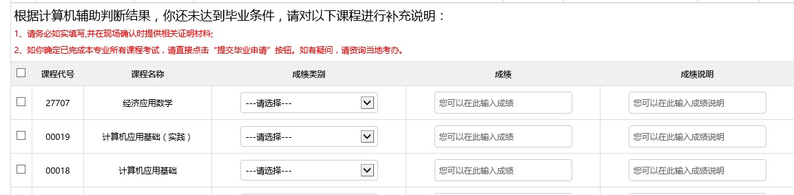 1、本省的全国计算机等级证书免考00018、00019、00051、00052课程的,请在毕业申请提交前先办理免考。办理方法为“一键免考”。