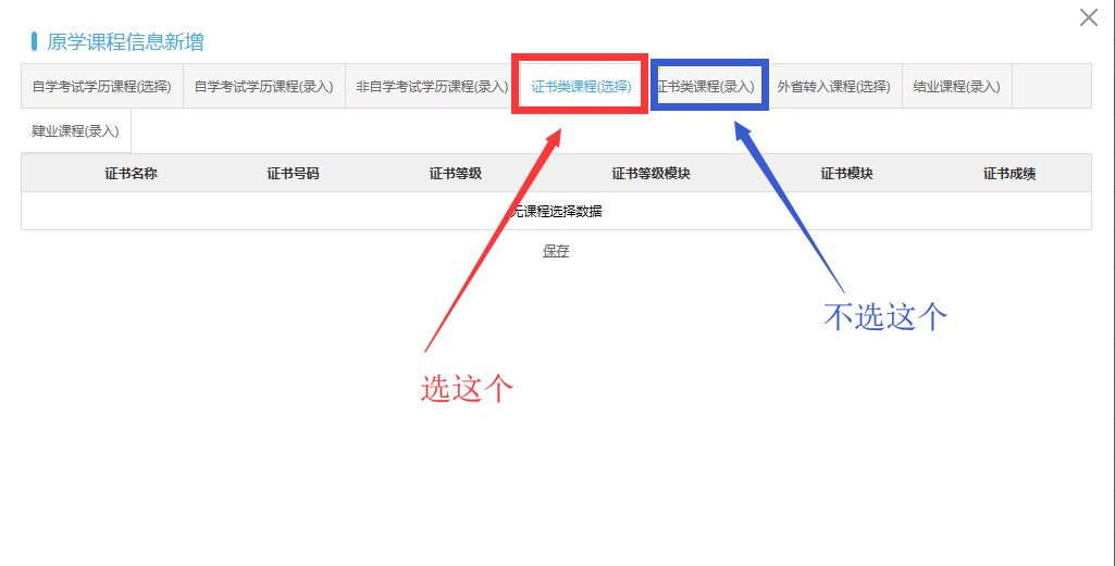 (2)有纸质实践成绩单或纸质转考成绩,如实填写即可,填写完毕后,点击【保存课程成绩】,所选课程跳转至【已有成绩】模块。