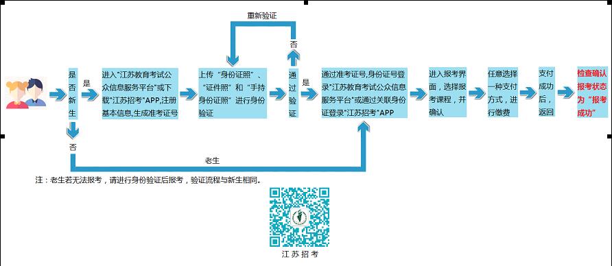 所有考生均须通过江苏教育考试公众信息服务平台或“江苏招考”手机APP报考,并且进行网上缴费。考生报考时如未完成身份验证,则须先完成身份验证方可报考。