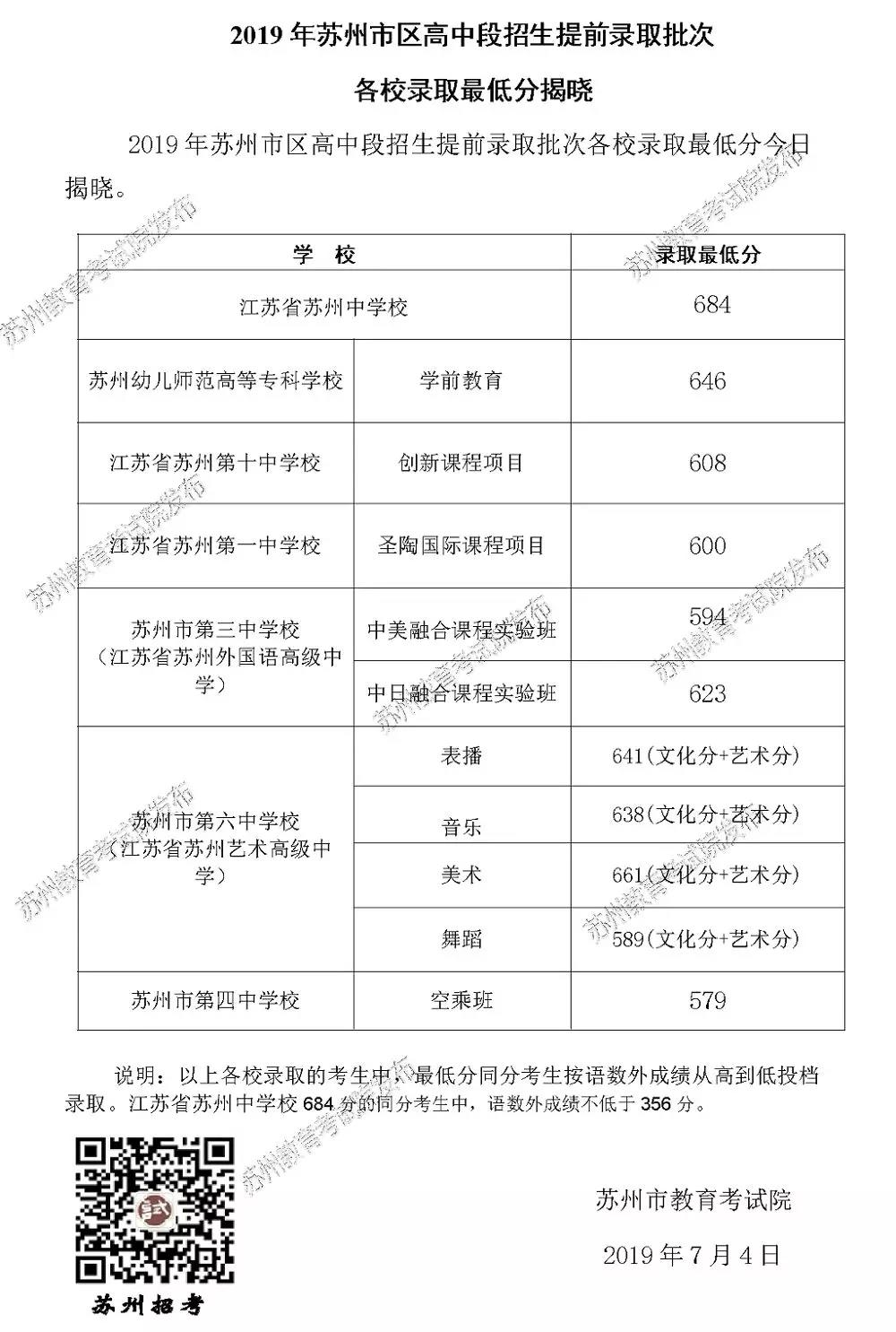 2019年苏州市区高中段招生提前录取批次各校录取最低分揭晓