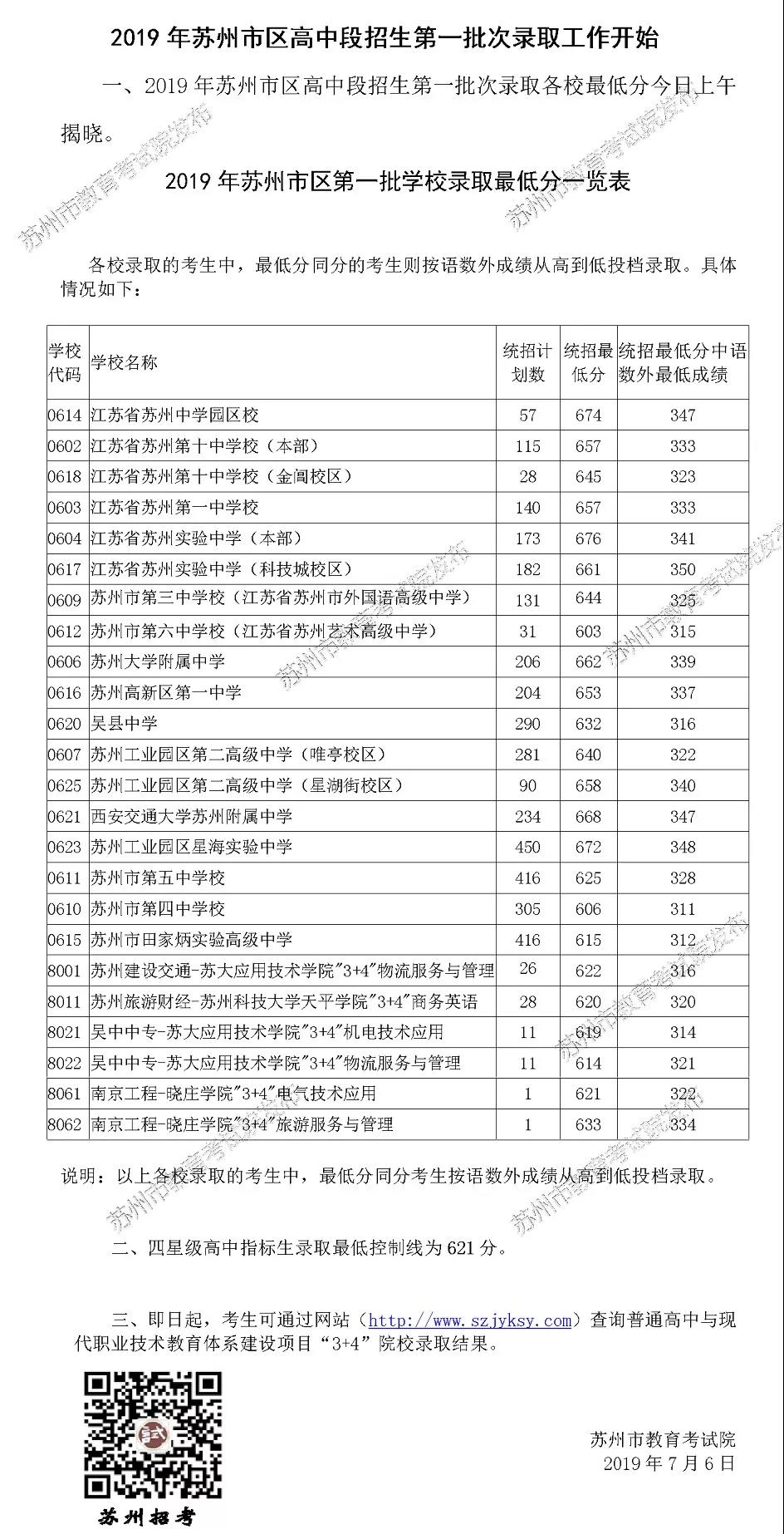 2019年苏州市区第一批学校(普高、3+4)录取最低分公布