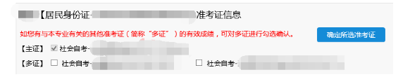 考生有本省多张准考证且其中成绩在本次毕业中需使用,则勾选相应准考证号,并点击【确定所选准考证】。(如勾选的多证没有电子准考证照片,按要求完成线上身份验证上后方可使用)。