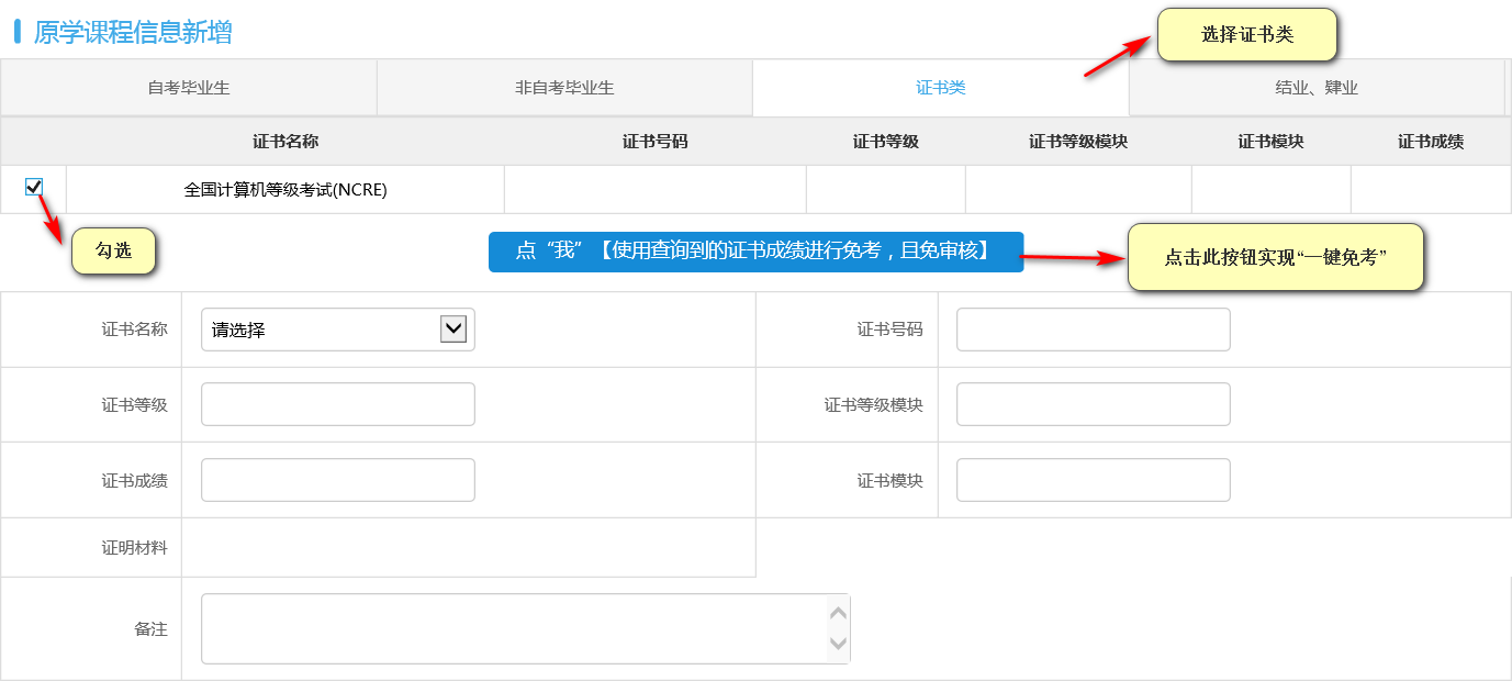 (2) 部分有资格证书课程的专业(如物流管理、采购供应管理、销售管理等)不需要提交免考申请,在办理毕业时按要求办理即可。
