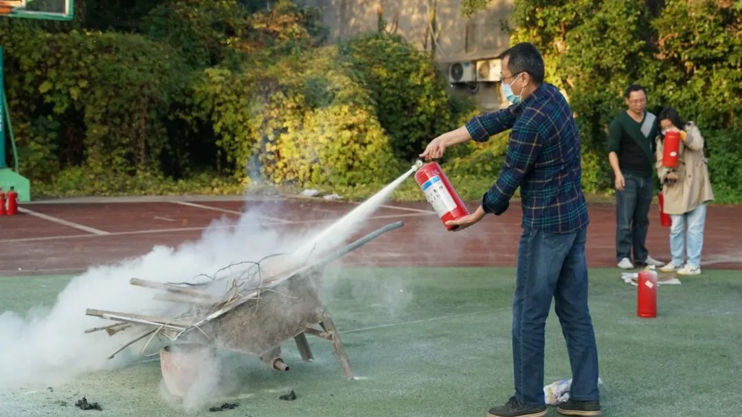 为了将所学知识付诸实践,“趁热打铁”普及灭火器的使用方法,大家通过紧急疏散演练从就近的安全通道快速离开会场,来到电教馆大院操场东北角进行消防灭火演练。通过将干粉灭火器一“看”二“提”三“拔”四“瞄”,对准火源根部喷射实现灭火,我院职工轮流操作,在实操过程中不断加深对干粉灭火器的使用技巧和注意事项的理解,熟练掌握灭火器的使用方法。