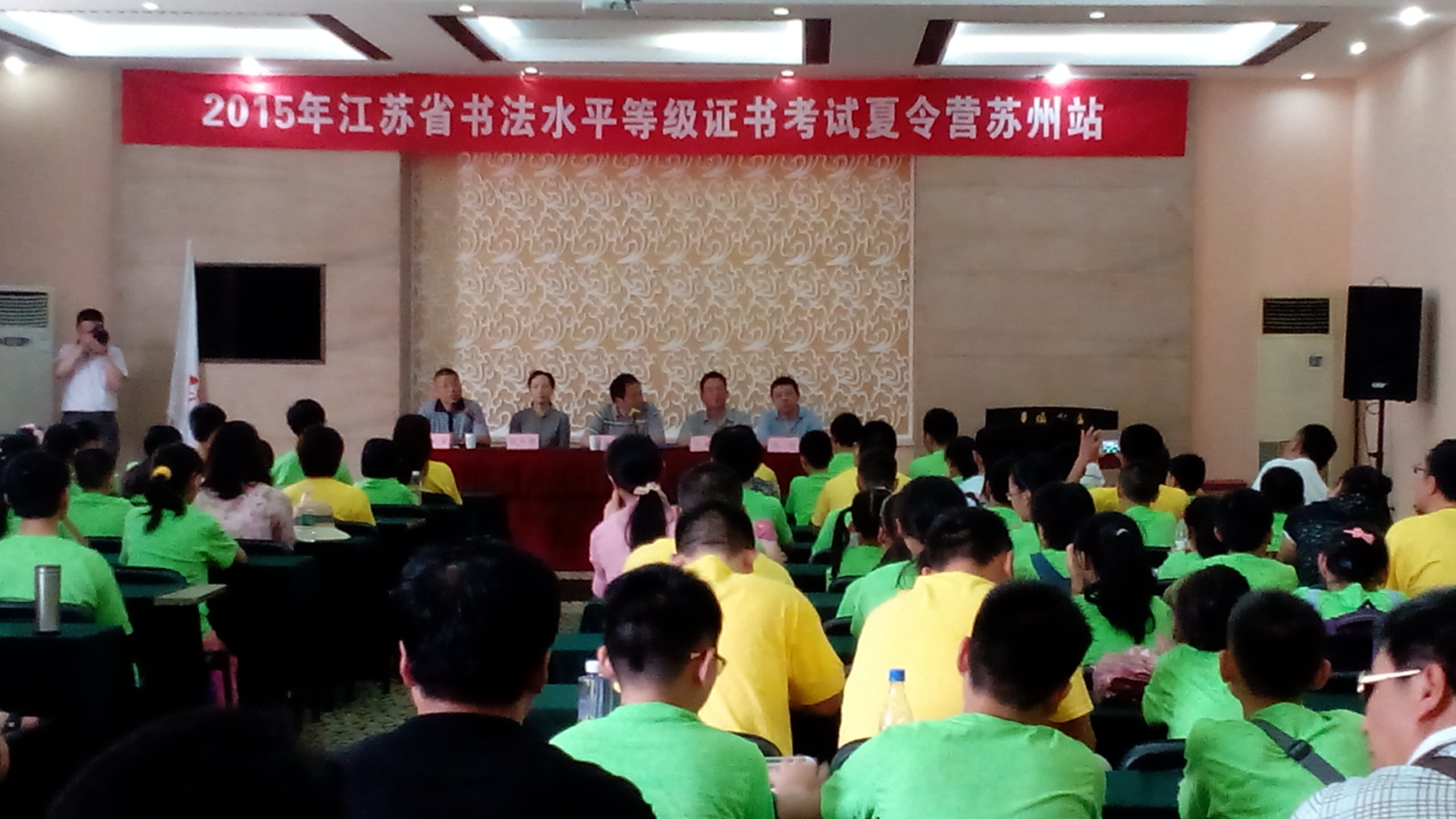 为继承与弘扬中华民族优秀文化,进一步推进我省书法水平等级证书考试工作,提升书法考试的社会影响力和服务水平,省考试院在暑假期间在南京和苏州两地举办2015年江苏省书法水平等级证书考试夏令营活动,获得江苏省书法水平等级证书考试5级(含5级)以上证书的优秀考生将有幸参加此次夏令营活动。今天,省考试院陆振飞处长、杨从意副处长、南艺成教院郑春泉院长、法红旗书记参加了夏令营苏州站的开营仪式,在7月15—17日的三天时间里,将有来自南京、徐州、南通、连云港、盐城、宿迁和扬州的112位营员参加夏令营活动。