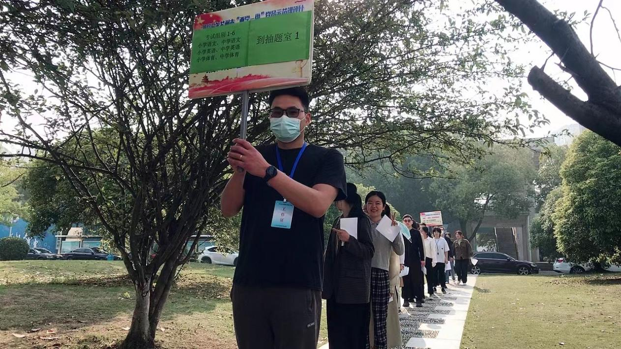 面试工作人员对进入候考室的考生用金属探测仪的进行检测,安排考生分科目入座。进入抽题室、备课室、面试室的考生,都有引导员引领,面试实施过程井然有序。