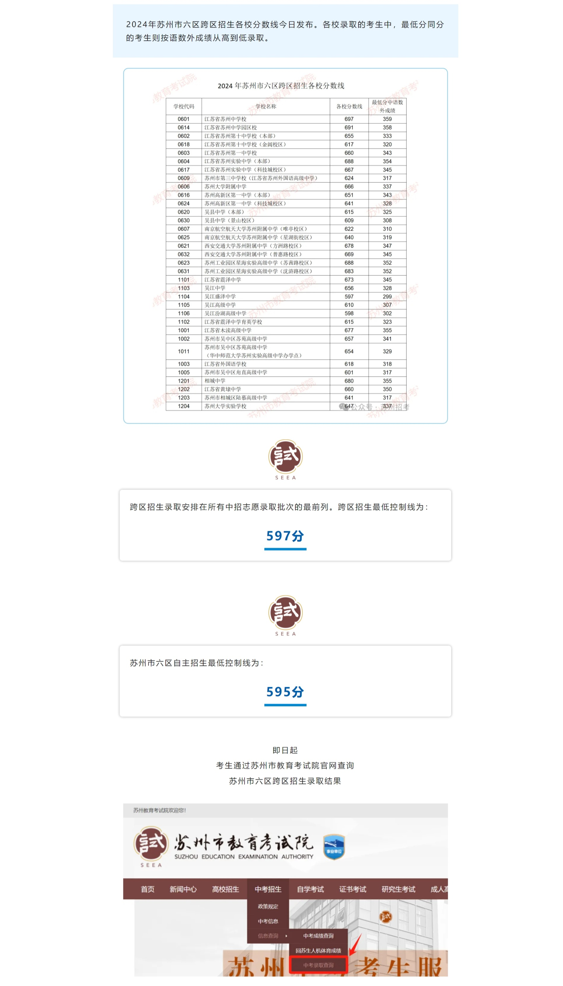 2024年苏州市六区跨区招生各校分数线及最低控制线、自主招生最低控制线公布