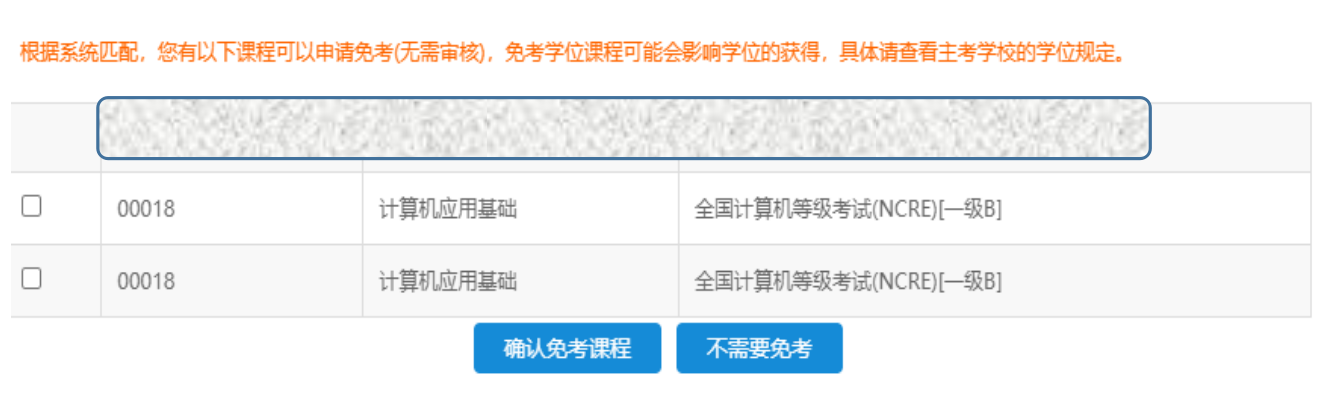 1.弹窗跳出对话框提醒可以申请对应课程的免考,点击“确认免考课程”后可直接得到免考审核结果(如图2)。