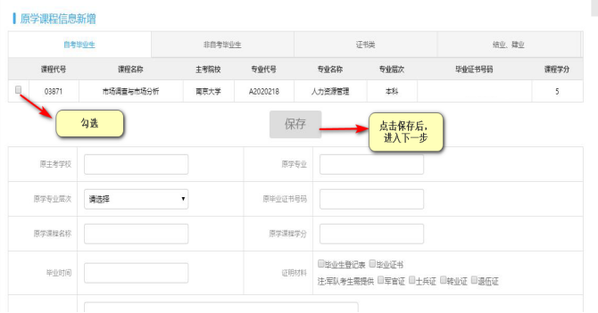 (六)使用本人江苏自考已毕业课程成绩用于申请免考的,可点击“自考毕业生”,如出现可勾选课程用于免考申请的(如图4),须勾选后再点击保存,返回图4界面,点击免考申请修改,确认无误后点击“提交申请”。