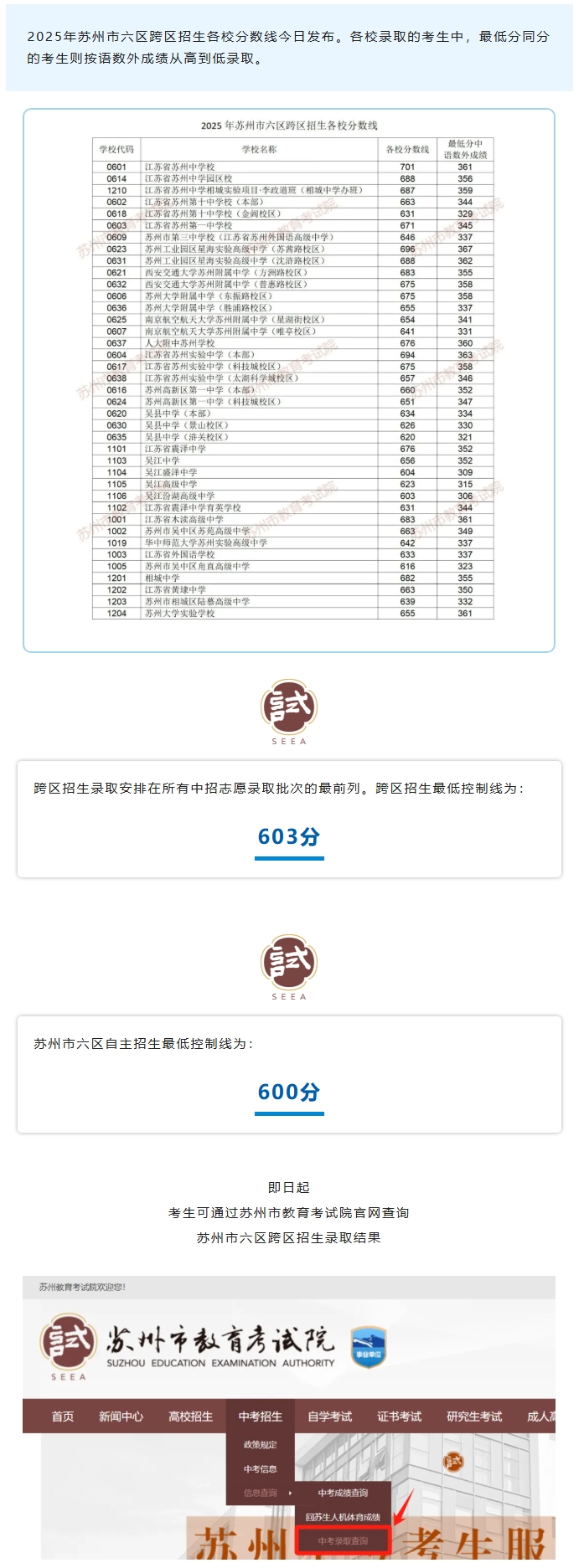2025年苏州市六区跨区招生各校分数线及最低控制线、自主招生最低控制线公布