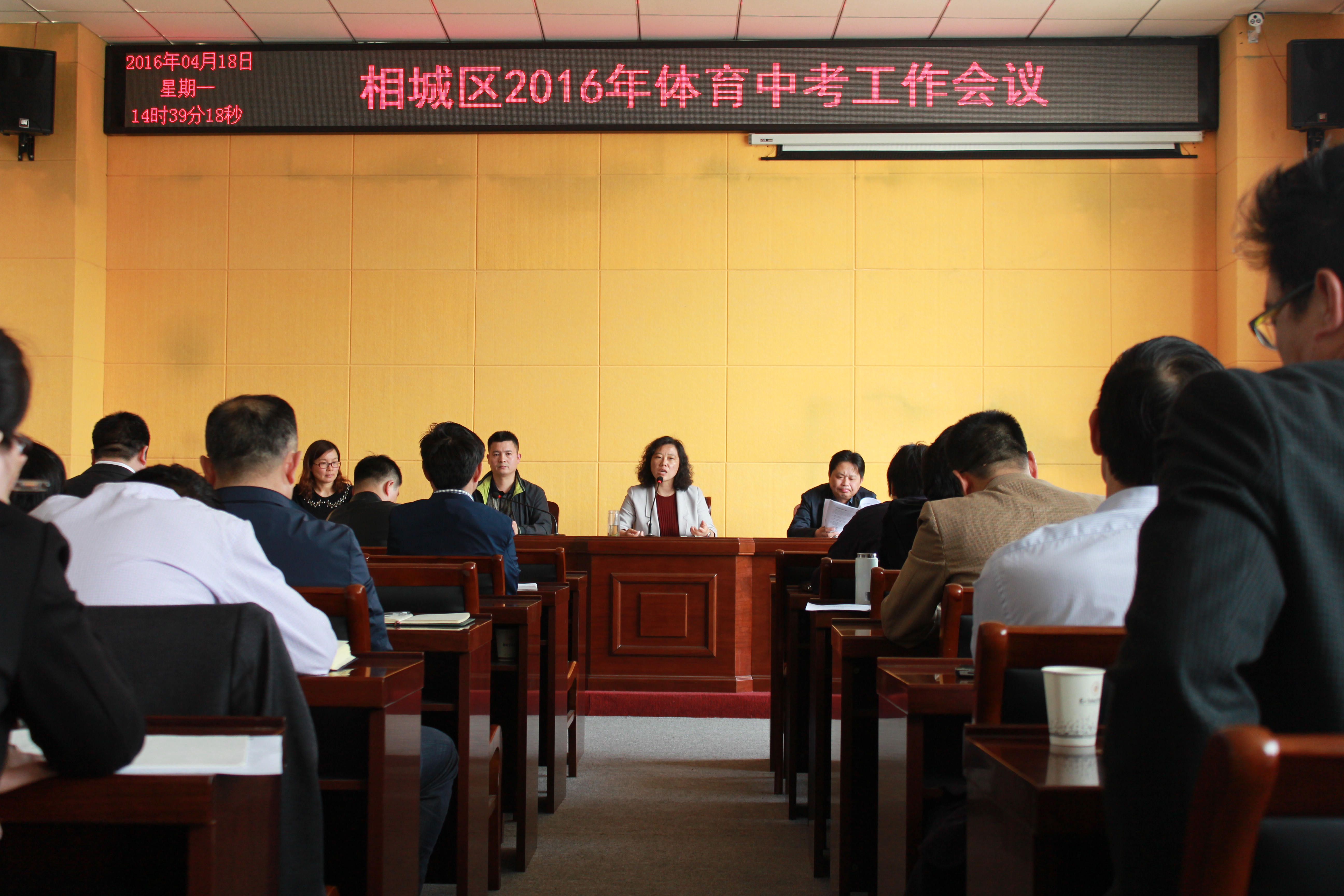 4月18日下午,相城区2016年体育中考工作会议在相城实验中学顺利召开,缪芙蓉副局长、招办徐建峰主任、普教科宁建英科长、教研室陈肖敏主任及招办全体工作人员、局工作人员、各初中学校校长、分管校长、教导、考务出席参加会议。